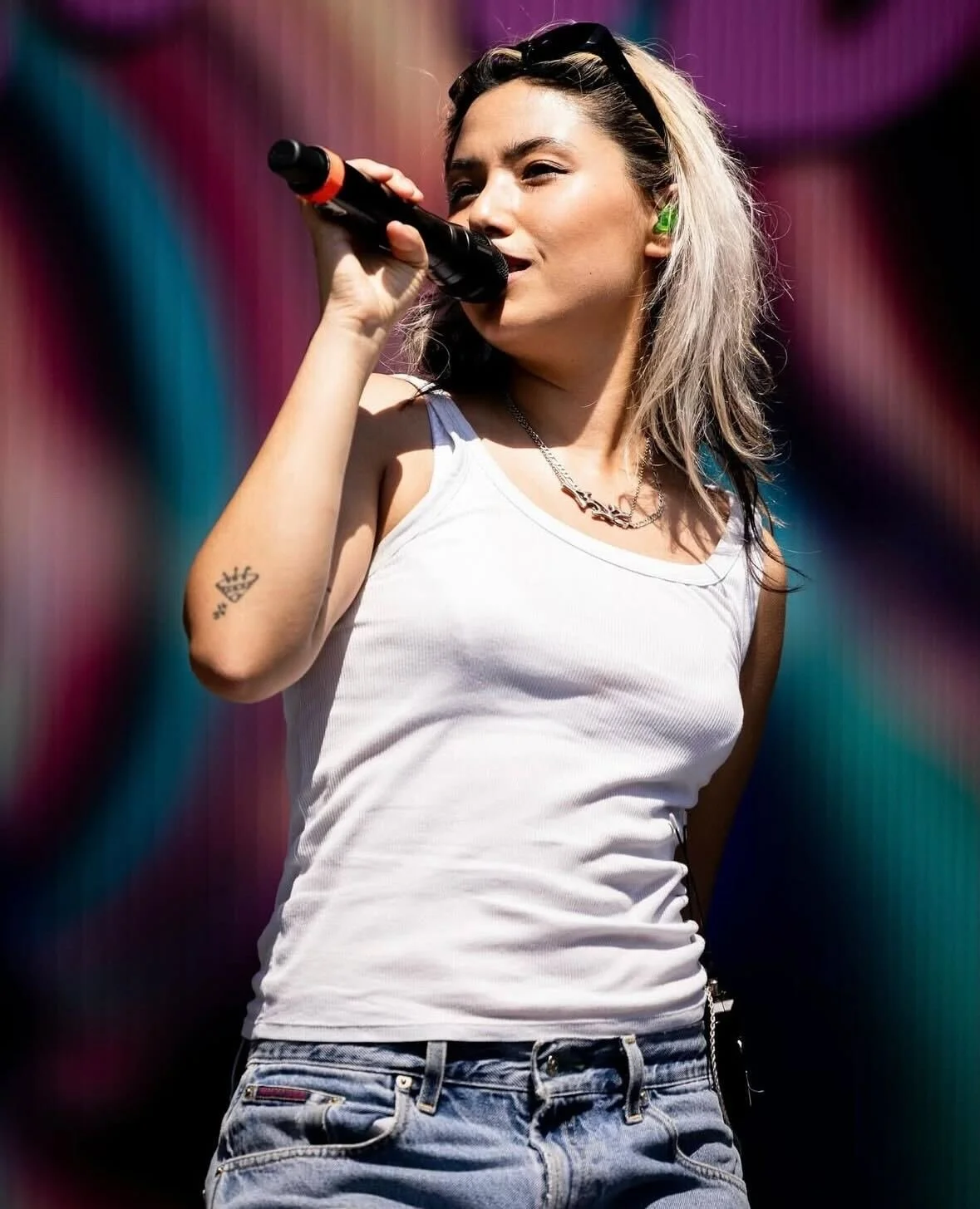 Los Angeles singer Claire Chicha, better known as Spill Tab, opened the Miller Lite Stage with her punctual 1:30 p.m. set on Friday, Oct. 10. Psychedelic colors swirled on the screen behind Chicha as she owned the stage in jorts, a white tank, ruby red cowboy boots, and her signature split-dyed hair. The booming techno music that blared as Chicha and her band entered the stage diluted into the gritty, percussion-heavy track “Window,” starting her set with an unmistakable alternative-rock sound. “Austin, are we feeling warmed up?” the singer punned to a crowd being sprayed with water by security in the blazing sun. Spill Tab quickly switched the mood with her 2020 French song “Calvaire,” made “a little sexier” with dreamy keys, concluding the romance language song. After some slow songs and hydration checks, Spill Tab let her keyboardist Austin Corona shine on “Athlete” as she gave emphatic, short breaths to the mic to complement the groovy, video-game-like keys. She immediately jumped into the high-energy track “Velcro” to return the set to rock infusions, exasperatedly singing, “How to use my head without my mouth” and finishing the track in a guitar battle with her bassist, her split-dyed hair covering her face. Prefaced as a breakup song — like most of her new album, Angie — “Hold Me” entranced the crowd with its instrumentation ready for a jazz club and Chicha’s small hand motions emphasizing the reflective, regretful lyrics. Spill Tab showed the most of her range with “by Design,” starting the song with a vocal mod on her microphone and ending with simple acoustic guitar. After playing a slow unreleased song about hoping for clarity in a relationship on the brink of starting or ending, she transitioned into her 2020 essentially indie hit “Cotton Candy,” during which she explored the stage and gave her drummer a hug while he played. As the catchy percussion and fast-paced strings of “CRÈME BRÛLÉE!” permeated the heat, the audience could not help but clap along to Spill Tab’s biggest hit. Despite an early set time and glitchy screens, Spill Tab successfully showed Austin that her sound knows no bounds.